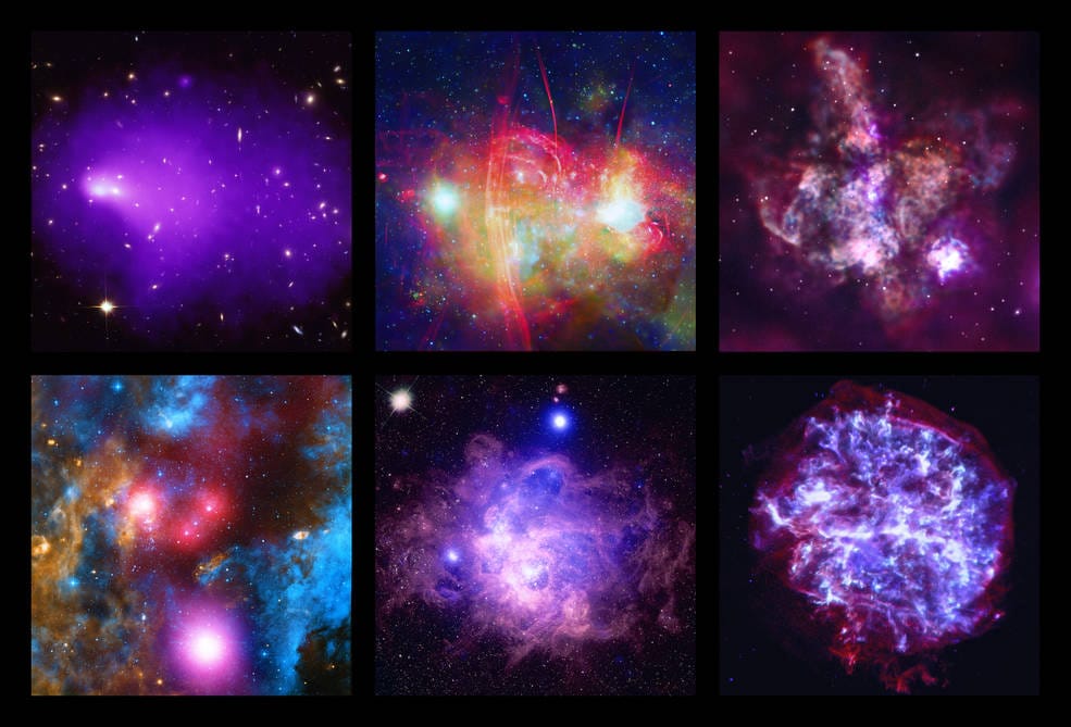 O Observatório de Raios-X Chandra da NASA comemora seu 20º aniversário com uma montagem de novas imagens, que mostram a diversidade de objetos que estuda. Da esquerda para a direita e de cima para baixo: Abell 2146 – o colossal sistema Abell 2146 é o resultado de uma colisão e fusão entre dois enxames de galáxias; Centro Galáctico – a região central da Via Láctea contém uma coleção exótica de objetos; 30 Doradus – no centro de 30 Doradus, uma das maiores regiões de formação de estrelas localizada perto da Via Láctea, milhares de estrelas massivas estão a soprar materiais e a produzir intensa radiação e fortes ventos; Cygnus OB2 – as estrelas massivas em Cygnus OB2 duram apenas alguns milhões de anos; NGC 604 – a galáxia mais próxima, Messier 33, contém uma região a formar estrelas, NGC 604, onde residem cerca de 200 estrelas massivas, quentes e jovens; G292.0+1,8 – é um tipo raro de remanescente de supernova que contém grandes quantidades de oxigénio. Créditos: NASA/CXC.
