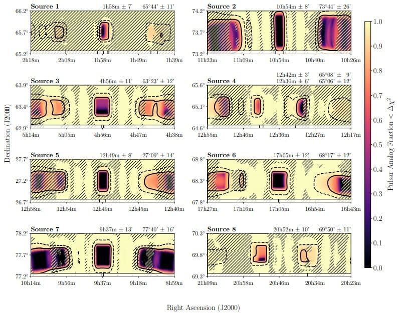 Posições de deteção das novas fontes FRB repetitivas CHIME/FRB. Créditos: Andersen et al., 2019.