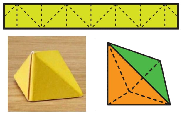 Conexões entre dimensão local e global da matemática. Em cima: Preparação da fita para entrecruzar um poliedro com o movimento do mesmo nó identificado no amuleto Yaka; em baixo, à esquerda: representação da dipirâmide triangular resultado do entrecruzamento da tira em cartolina; em baixo, à direita: dipirâmide triangular com as arestas invisíveis assinaladas. After Gerdes, 2012b)