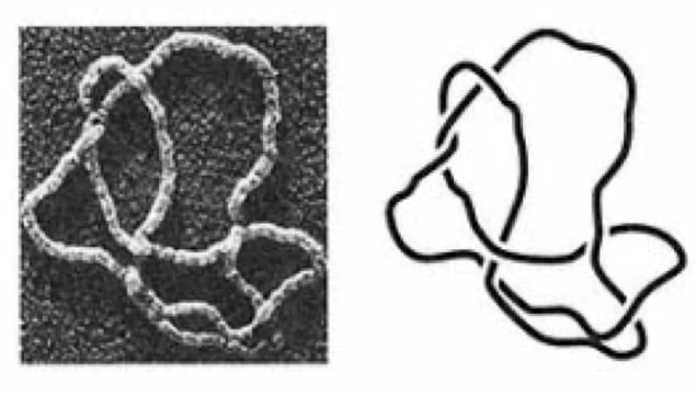A teoria dos nós tem ajudado as práticas dos biólogos na classificação e análise dos padrões de nós que a Natureza utiliza para armazenar genes. À esquerda: Filamento de ADN obtido por um microscópio eletrónico. À direita: estrutura do nó evidenciada pelo filamento de ADN. After Devlin, 2000 – referência [1] da parte 3).